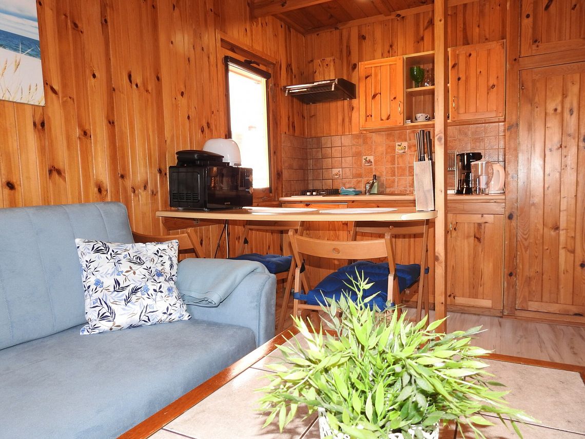 - 2-poziomowe: u góry 2 sypialnie oddzielnie zamykane (1 z podwójnym łóżkiem małżeńskim, jedna z dwoma pojedynczymi łóżkami dla dzieci); na dole salon z aneksem kuchennym i łazienką z prysznicem